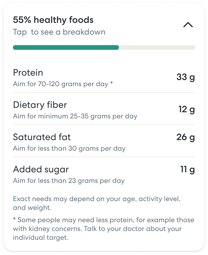 We explored several options, gathered feedback from expert stakeholders and users, and landed on a system that focused on including four healthy food groups with each meal: produce, lean protein, complex carbs, and healthy fats.